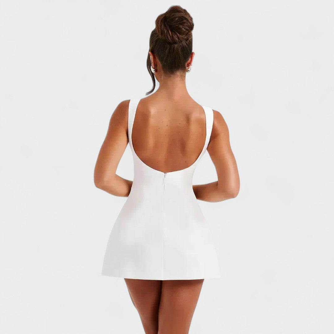 Тържествена мини рокля с A-образен силует и лодковидно деколте