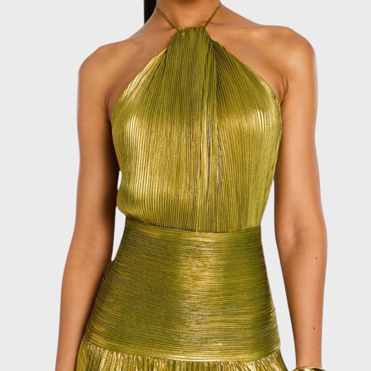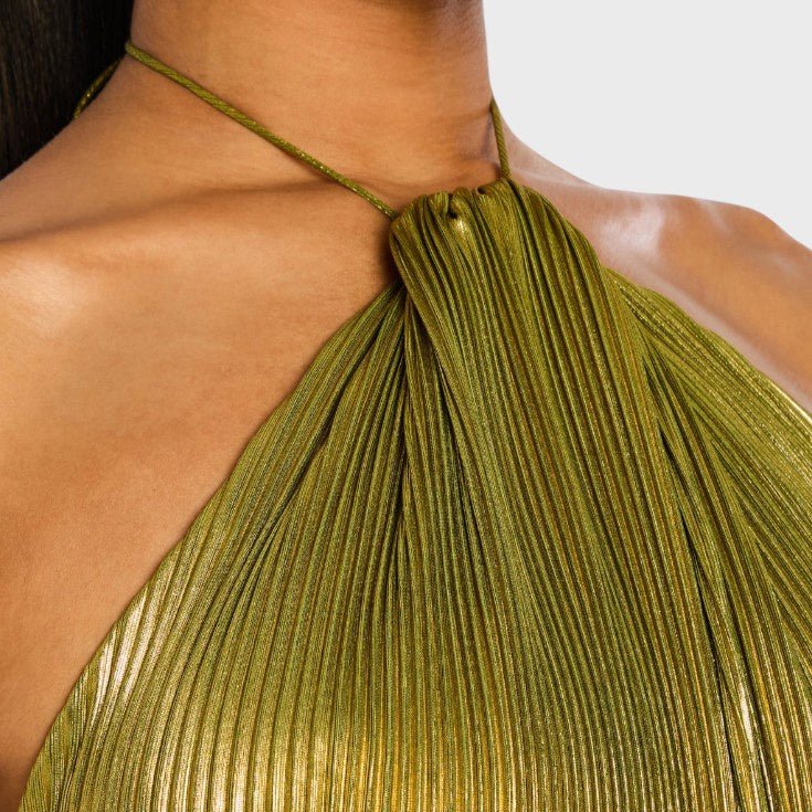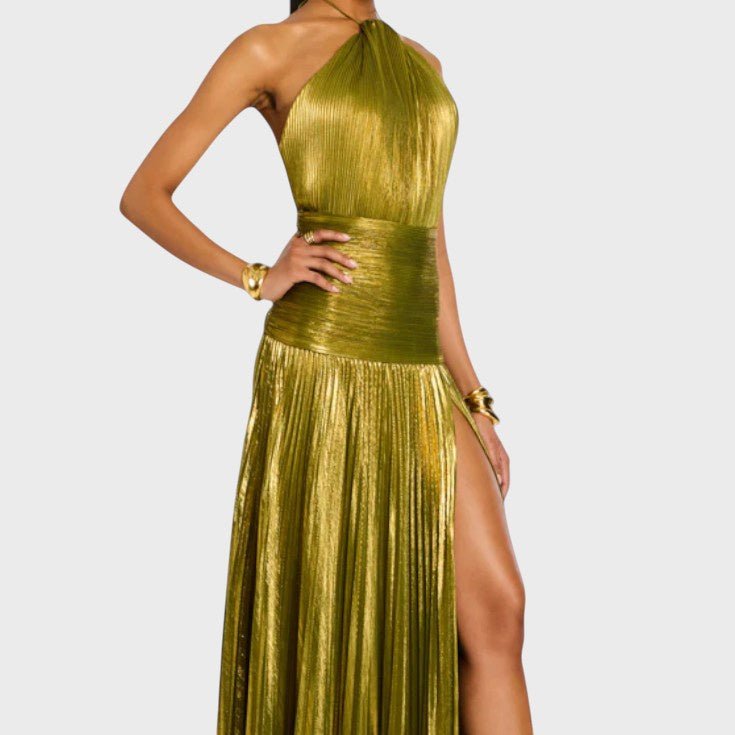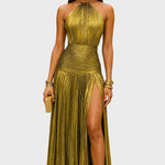 Роклята Вилма очарова с металик перидот нюанс, ефирна силует и изискани детайли. С халтер деколте, открити гърба и висок разрез, съчетава смелост и елегантност – идеална за гала вечери, вечери и незабравими нощи, изпълнени с мистерия и женственост.