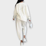 Този комплект е перфектната дефиниция на небрежна елегантност. С модерен крой и удобна материя, той е идеален за всекидневие, пътувания или дори за изтънчен градски вид. Неутралният цвят позволява безкрайни комбинации и предава лекота и стил без усилие.