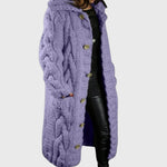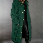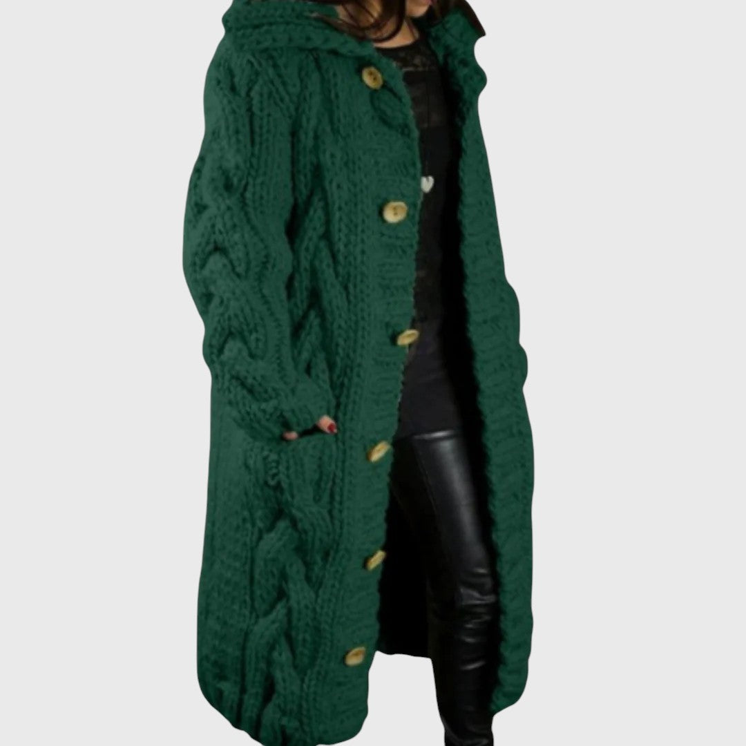 Този плетен палто-кардиган впечатлява с дебела кабелна плетка и мек материал, който осигурява максимален комфорт през студените дни. Качулката и копчетата отпред добавят функционалност и модерен характер, без да жертват женствеността.