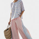Сладост и лекота във всяка стъпка. Комплектът Дейзи в нюанси на розово и синьо комбинира топ с вълнообразни линии и широки, проветриви панталони, създавайки свеж и удобен вид, идеален за слънчеви дни на морето.