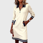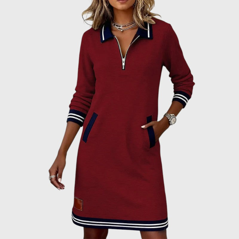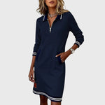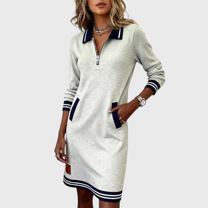 Роклята НАДЕЖ™ впечатлява с изчистена линия и стилни контрастни кантове, които подчертават силуета и придават модерен, изискан вид. Полузипът отпред добавя практичен акцент и позволява лесно регулиране според визията и настроението ви.