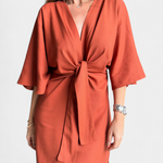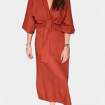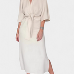 Семплост, която очарова с силует, създаден да подчертае естествено. Роклята Наталия комбинира дълбоко V-образно деколте с кимоно ръкави и централен възел, който нежно акцентира на талията. Нейната структурирана тъкан и функционален дизайн я правят универсална и елегантна основна рокля.