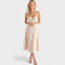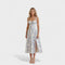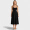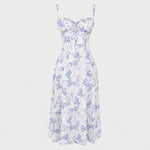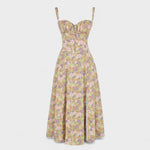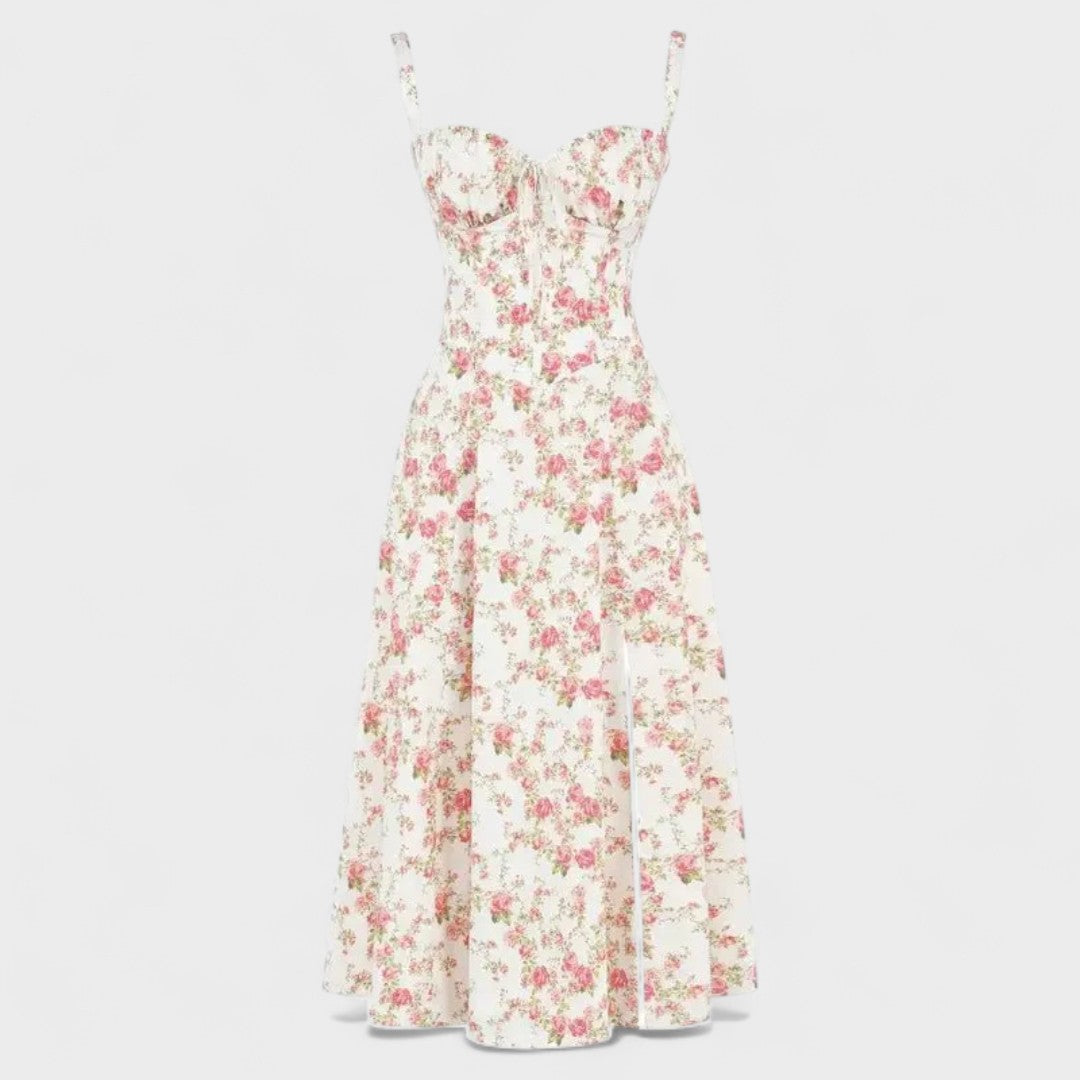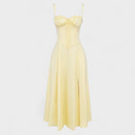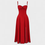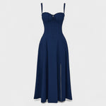 Тази женствена миди рокля се отличава с перфектен крой, който подчертава силуета и придава изискан вид. Елегантната корсетна горна част с презрамки и дискретни детайли придава софистицирано усещане, докато деликатният разрез в долната част добавя нотка на сексуалност и свобода на движението. Идеална е за специални поводи, вечерни излизания или романтични моменти, в които искате да блеснете.