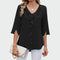 Елегантна черна блуза с романтични волани, които добавят движение и женственост. V-образно деколте с дискретни волани отпред подчертава стила, докато 3/4 ръкави с цепка отстрани придават модерен акцент. Идеална за вечерни излизания, но и за шикозни появи в офиса, лесно се комбинира с панталони или пола за финален резултат.