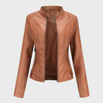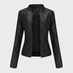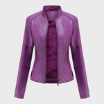 Това дамско кожено яке съчетава класическа визия с модерна кройка, подчертаваща женствената линия. Изработено от висококачествена мека еко кожа, то осигурява комфорт и издръжливост без компромис със стила. Централният цип и фините декоративни шевове придават изискано излъчване, а стоящата яка с копчета добавя нотка на бунтарски чар. Перфектно за носене с дънки, рокля или пола – това яке е задължителен елемент за всяка стилна гардеробна.