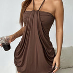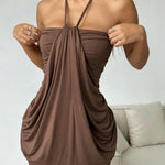 Мини рокля в шоколадов нюанс, която излъчва елегантност и женственост. Има връзка около врата, впечатляващ драпирал детайл отпред и тясна силуета, която обгръща тялото. Идеална за вечерни излизания и специални поводи.