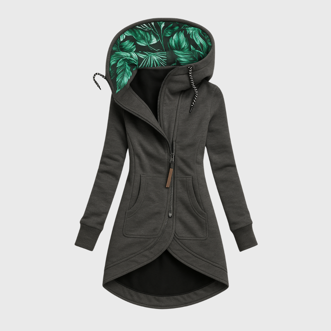 Este abrigo femenino combina modernidad y practicidad en un diseño único e impresionante. La amplia capucha con un estampado interior añade un irresistible toque de moda, mientras que la parte trasera alargada proporciona un corte elegante y cómodo. Es la elección ideal para quienes buscan una prenda versátil, estilosa y adecuada para cualquier ocasión.